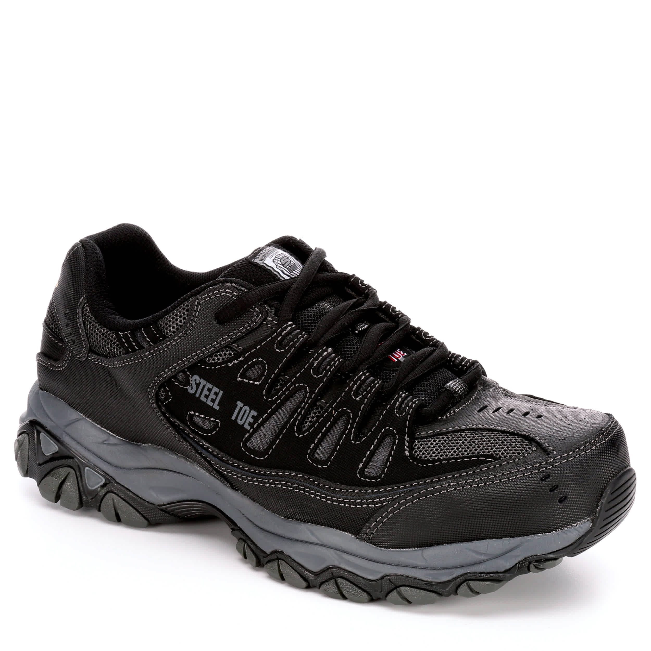 Keep ahead of every challenge in the 77055 men's work sneaker from Skechers. This silhouette is ready for anything with it's steel toe and high abrasion textured leather upper. Not only does it provide extreme traction with it's lug patterned sole but it features a comfortable Memory Foam insole and Relaxed Fit® design.